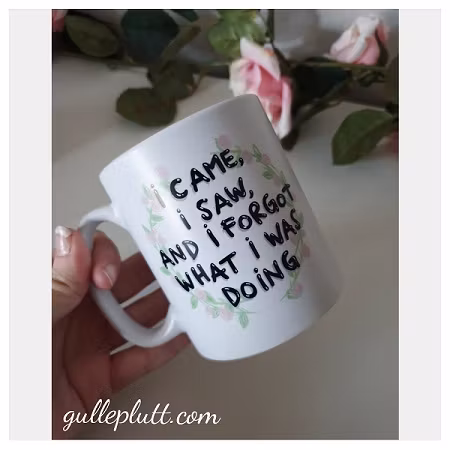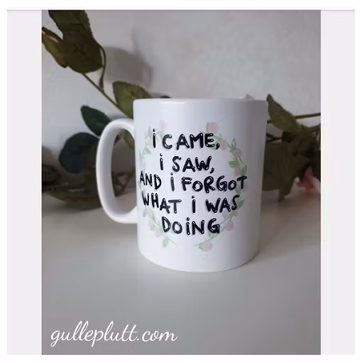 Rolig kaffemugg, med texten "I came, I saw, and I forgot what I was doing".